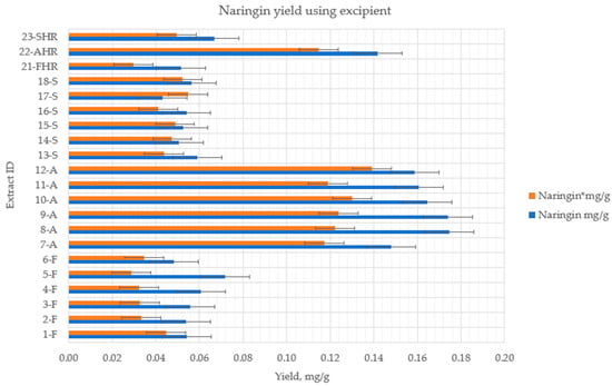 Using excipients as adsorbent may improve the solubility of certain active substances in drugs that have poor water solubility [27,32]. Therefore, in this study, we decided to use excipients during extractions to determine whether they could increase the yields of flavanones. The used heat reflux extraction and ultrasound-assisted extraction bath methods obtained most flavanones (Section 2.2.4). These extraction conditions using additional compounds were applied to improve the solubility of flavanones.