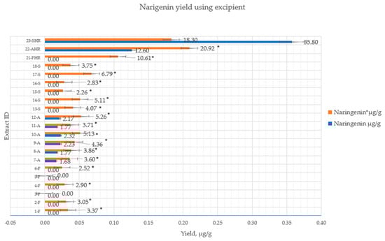The quantitative yield of flavanone aglycones using excipients (1%). p < 0.05 when control samples without excipients were compared to samples with magnesium aluminometasilicate *. Extract ID and preparation conditions are displayed in Table 1.