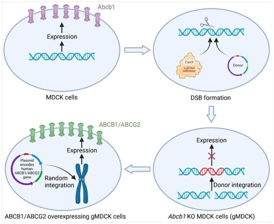 Schematic illustration of generating Abcb1 KO MDCK (gMDCK) cells and ABCB1/ABCG2 overexpressing gMDCK cells. After transfection, the target sequence is recognised and cleaved by the sgRNA-Cas9 complex, followed by the integration of the donor template through the HDR repair pathway. The expression of Abcb1 is thus disrupted in Abcb1 KO MDCK (gMDCK) cells. To generate ABCB1/ABCG2 overexpressing gMDCK cells, plasmids encoding human ABCB1 or ABCG2 genes are delivered into gMDCK cells and randomly integrated into the genome, leading to constant overexpression of ABCB1 or ABCG2 protein. Created with BioRender.com.