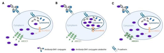 Proposed mechanisms of cellular distribution of catabolite of antibody maytansine conjugate in wild-type (A), SLC46A3-KO (B) and ABCC1-KO (C) cancer cells. Created with BioRender.com.