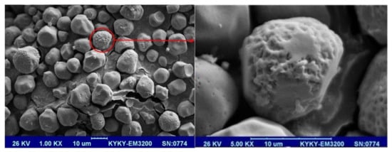 To evaluate the morphology and the surface of the obtained particles, a scanning electron microscope (SEM, MIRA3, TESCAN instrument, Brno, Czech Republic) was employed. After gold coating the samples (samples mounted on a metal stub with double-sided adhesive tape before coating) under vacuum in an argon atmosphere, the images of the particles were obtained by a direct current sputter technique (Emitechk450X, Lewes, UK) [20].