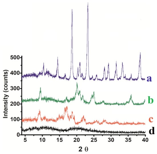 X-ray Diffraction pattern of mannitol (a), the spray dried optimized nano simvastatin (formulation 13, Table 3) (b), raw simvastatin (c), and lecithin (d).