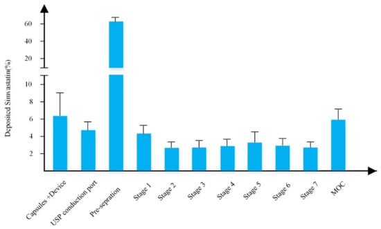 The SEM images shown in Figure 2 showed that the spray dried particles were in respirable size (1–5 µm). The spray dried simvastatin formulation was actuated into the NGI and the deposition results are shown in Figure 4. The results showed that although around 60% of the drug was deposited in the pre-separator, the amount of simvastatin deposited in the lower stages of the NGI was good enough for the delivery of simvastatin to the lungs. The results also showed that the value of FPF was 19.75 ± 2.45% with the mass median aerodynamic diameter (MMAD) of 1.33 ± 0.18 µm which makes these nanoparticles ideal for the delivery of drugs to the lungs. This research thus paves the way for the future effective therapy of IPAH for simvastatin via the pulmonary route [32,33].