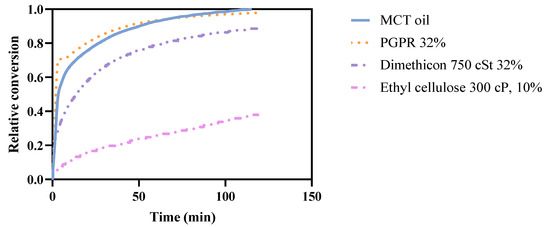 Relative conversion of MCT oil in the presence of different bulk retarders: PGPR 32%, dimethicon 750 cSt 32%, ethylcellulose 300 cP 32%. The curve is a mean value of duplicate measurements. The relative standard error of the method is 1.2%.
