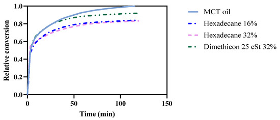 Thermodynamic activity, final conversion (2 h), and the time point when reaching half final conversion (t50%) of hexadecane 16% and 32%, and dimethicon 25 cSt 32%.