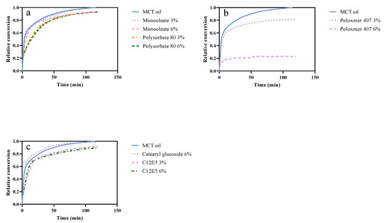 From Figure 3, little difference in final conversion is observed among formulations having monooleate 3% and 6%, polysorbate 80 3% and 6%, or cetearylglucoside 6%. A slight decrease in conversion until 3000 s was seen when polysorbate 80 at concentrations of 3% and 6% were added into the formulation. However, the retardation is clearer when monitoring t50%, in Table 5, where polysorbate 80 and C12E5 (3% and 6%) need much more time to reach 50% conversion. Although the concentration of polysorbate 80 doubled from 3% to 6%, both conversion curves were quite similar and ended up with conversion of around 93% (Table 5). A significant retarding effect was observed when adding 6% poloxamer 407 into the formulation. In this case, less than 30% of the MCT oil was digested by pancreatic lipase. Thus, it is observed that interfacial additives may influence the degradation.