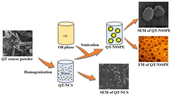 According to our previous study, Labrafac Lipophile WL 1349 was used as oil phase of QT–NSSPE []. The schematic diagram of formation process of QT–NSSPE can be seen in Figure 1. Firstly, the appropriate volume of oil and freshly obtained QT–NC were added into a glass vial to get 10 mL of mixed liquid. Next, the glass vial of mixture was placed into a beaker with ice water and then processed by an ultrasonic cell grinder (JY92-IIN, Ningbo Scientz Biotechnology Co., Ltd., Ningbo, China) with a dipping probe close to the oil/water interface to form QT–NSSPE, for 9 min at an intensity level 6 and 50% pulses. In addition, the duration of ultrasonication was 3 s per time and the interval time was 4 s, in support of heat dissipation.