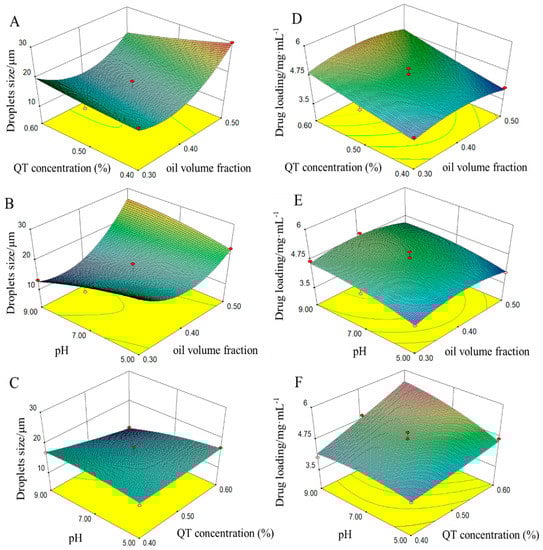 The interaction effects among the three independent variables on drug loading of QT–NSSPE (Y2) were studied. As shown in Table 3 and Figure 3D, there were not significant interaction effects between QT concentration and oil volume fractions on the drug loading of QT–NSSPE (p = 0.8183), the same phenomenon (Figure 3E) was observed at pH and oil volume fractions (p = 0.7020). The reason may be associated with the fact that the oil volume fraction has little influence on drug loading of the QT–NSSPE (X1, p = 0.8252). The effect of pH and QT concentration on the drug loading (Y2) was studied when the oil volume fraction was kept constant. As can be seen in Figure 3F and Table 3, the use of higher pH in combination with the larger QT concentration would lead to an increase in the drug loading of QT–NSSPE. As previously stated, QT has a higher surface active when the pH is relatively alkaline, which is beneficial for the formation of QT–NSSPE. Moreover, the more QT was used in the formulation, the more QT–NC could be adsorbed at the surface of QT–NSSPE droplets, which could result in a higher drug loading of QT–NSSPE.