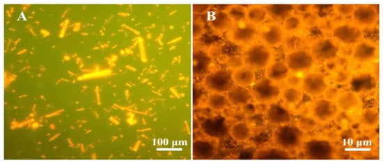 QT has a strong fluorescence when excited by UV-lights [], therefore, QT–NSSPE was observed by FM to confirm the adsorption behavior of QT–NC on the surface of emulsion droplets. QT–NSSPE was dropped on a glass and observed with a fluorescence microscopy (BX60, Integrated DS-SMC-UI digital imaging system, Olympus Co., Ltd., Tokyo, Japan) immediately.