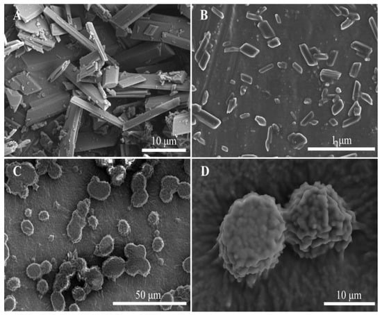 SEM images of (A) QT coarse powder (B) QT–NC, (C) QT–NSSPE, and (D) surface of QT–NSSPE droplets.