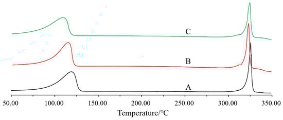 The DSC thermograms of QT coarse powder, lyophilized QT–NC, and QT–NC adsorbed in QT–NSSPE were presented in Figure 6. QT coarse powder exhibited a sharp endothermic peak at 321 °C, which was attributed to the melting point of QT [,], while the broad endothermic peak between 80 °C and 125 °C was ascribed to the dehydration of QT. The DSC thermogram of QT–NC showed an endothermic peak at 319 °C. An endothermic peak at 321 °C of QT–NC adsorbed in QT–NSSPE was also detected. There were no significantly differences in DSC thermograms of QT in the three samples suggesting the crystalline nature of quercetin has not changed.