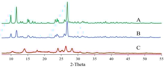 XRD curves of (A) QT coarse powder, (B) QT–NC lyophilized powder, and (C) QT–NC in QT–NSSPE.