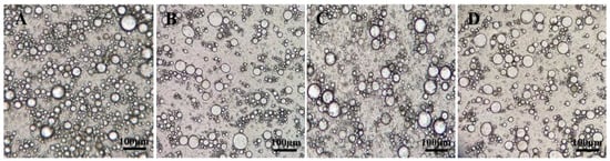 Optical micrographs of QT–NSSPE (A) freshly prepared and stored at (B) 4, (C) 25, and (D) 40 °C for 30 days.