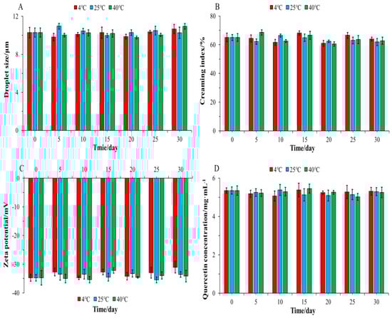 Fresh QT–NSSPE were stored vertically in tubes at 4, 25, and 40 °C, respectively. The droplets shape, droplets size, CI, zeta potential, and QT content of QT–NSSPE were determined after storage for 5, 10, 15, 20, 25, and 30 days to evaluate the physical stability of QT–NSSPE using the same methods as described in Section 2.6 and Section 2.7.