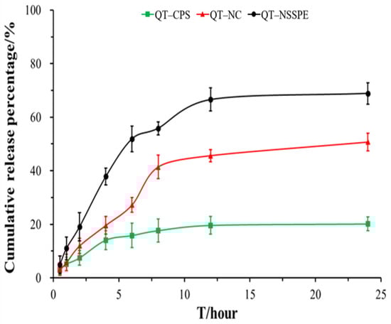 The in vitro dissolution profiles of QT–NSSPE, QT–NC, and QT–CPS in PBS (pH = 7.4) containing 1.0% SDS (1%, w/v). (n = 3, mean ± SD).