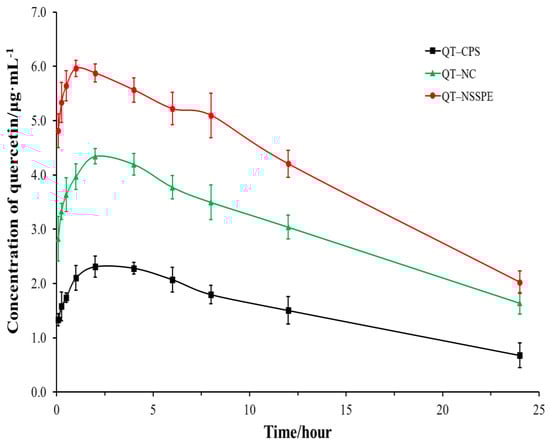 Plasma concentration–time curves of QT–CPS, QT–NC, and QT–NSSPE after a single oral administration at the QT dose of 50 mg·kg−1 in rats (n = 6, mean ± SD).