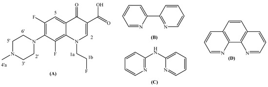 (A) The syntax formula and H-atom numbering of fleroxacin (Hflrx). (B–D) The N,N′-donors used as co-ligands: (B) 2,2′-bipyridine (bipy). (C) 2,2′-bipyridylamine (bipyam) and (D) 1,10-phenanthroline (phen).