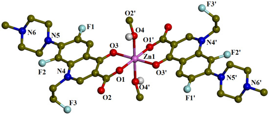 Compound 3 is a centrosymmetric mononuclear complex, with the Zn(1) atom being on the inversion center. The fleroxacin ligands are deprotonated, being bidentately coordinated to the zinc ion via the pyridone oxygen O(3) and the carboxylate oxygen O(1), forming two six-membered chelate rings. The Zn atom has a slightly distorted octahedral geometry resulting from a ZnO6 coordination sphere formed by four oxygen atoms of fleroxacin ligands and two oxygen atoms of the methanol ligands. The Zn–Ocarb (Zn(1)–O(1) = 2.0116(17) Å) are the shortest bond distances and the Zn–OMeOH (Zn(1)–O(4) = 2.129(2) Å) are the longest bond distances in the coordination sphere.