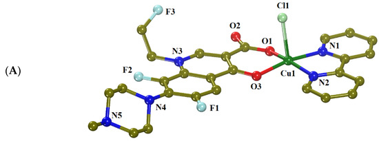 Fleroxacin (Hflrx = 6,8-difluoro-1-(2–fluoroethyl)-7-(4-methylpiperazin-1-yl)-4-oxoquinoline-3-carboxylic acid, Figure 1A) is a second-generation trifluorinated fluoroquinolone with a broad spectrum of activity [16,17]. Its main mechanism of action is the inhibition of the DNA-supercoiling activity of DNA gyrase [18]. Its major advantage over other fluoroquinolones is its long half-life, which allows dosing once daily [19], although it appears to have adverse side effects [20]. Despite its extensive use as a fluoroquinolone, there are few reports on the synthesis, characterization and biological activity of metal complexes with fleroxacin, including a Zn(II) (i.e., [Zn(flrx)(phen)(H2O)](NO3), phen = 1,10-phenanthroline) [21], a Ga(III) (i.e., [Ga(flrx)3]) [22], a 99mTc [23] and two Cu(II) complexes (i.e., the cationic complex [Cu(flrx)(phen)(H2O)](CH3COO)·9.8H2O [24] and the neutral complex [Cu(flrx)(bipy)Cl]·4H2O, bipy = 2,2′-bipyridine [25]).