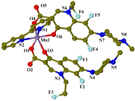 Manganese complex 9 is mononuclear and the deprotonated fleroxacinato ligands are bound to the manganese(II) ion Mn1 in the usual bidentate chelating mode via the arboxyl oxygen and a arboxylate oxygen atoms. The octahedral environment of the manganese ion in which the pairs of chemically equivalent oxygen atoms of the quinolonato ligands are both in cis geometry is slightly distorted. This geometric isomerism is the rarest of the three possible geometries in metal-bis(quinolonato)-(α-diimine) systems and has been observed, to our knowledge, only in the nickel complex [Ni(flmq)2(bipy)2] (flmq = flumequinato) so far [52].