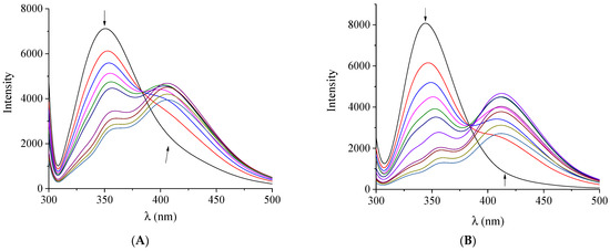 Fluorescence emission spectra (λexcitation = 295 nm) of a buffer solution (150 mM NaCl and 15 mM trisodium citrate at pH 7.0) containing (A) HSA (3 μM) upon addition of increasing amounts of complex 1, and (B) BSA (3 μM) upon addition of increasing amounts of complex 2. The arrows show the changes in intensity upon increasing amounts of the complex.