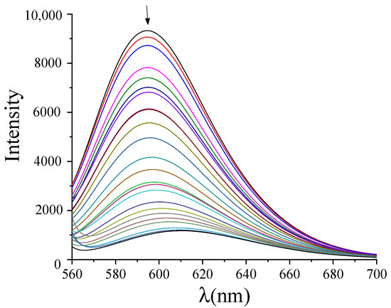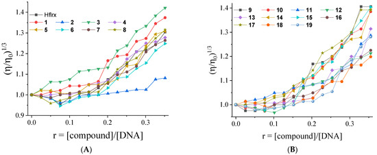 The SA-quenching constants (kq) for the compounds (Table 5) were calculated with the Stern–Volmer quenching equation (Equations (S2) and (S3)). The kq values are much higher than 1010 M−1s−1, indicating the existence of a static quenching mechanism [63] that proves the interaction of the compounds with the albumins. In all cases, the kq constants of complexes 1–19 are much higher than that of free Hflrx, indicating that the formation of coordination compounds leads to increased affinity of the quinolones for the albumins. Of the compounds studied, complexes 3 and 15 have the highest kq values for HSA and BSA, respectively (kq(HSA),3 = 2.26(±0.10) × 1013 M−1s−1 and kq(BSA),15 = 5.12(±0.17) × 1013 M−1s−1). The kq constants of the complexes are within the range of previously reported values for metal(II)–quinolone complexes [26,27,28,29,30,31,32,33,34,52,56,57].