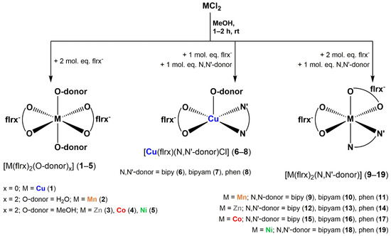 2.2.3. General Synthetic Procedure for Complexes [M(flrx)2(N,N′-Donor)2] (M(II) = Mn(II), Zn(II), Co(II), Ni(II), and N,N′-Donor = bipy, bipyam, phen) (Complexes 9–19)