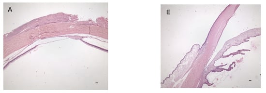 The right eyes of rabbits from the cryo group showed the following changes at the cryotherapy site: the sclera was intact, the choroid was thinned, and the retina was partially replaced by choroidal tissue that penetrated the disrupted pigment epithelium (Figure 3A). Only a thin limiting membrane with a small number of cells was found on the inner surface of the defect (Figure 3B). The transitional zone between normal retina/choroid and a chorioretinal scar was observed (Figure 3C). Intact retina and choroid were found outside the cryotherapy site (Figure 3D) and the choroid revealed vascular dilatation in some cases. The ciliary body was usually edematous or showed bleeding into the tissue due to a needle injury or a drop in intraocular pressure during vitreous sampling. Edematous or inflammatory changes of various extents were observed in the conjunctiva. The right eyes from the non-cryo group showed intact eyeball layers (Figure 3E,F). Only one eye revealed corneal vascularization at the limbus and edematous or inflammatory changes were again found in the conjunctiva (Figure 3G,H). The left control eyes did not show any considerable pathological changes in either group.