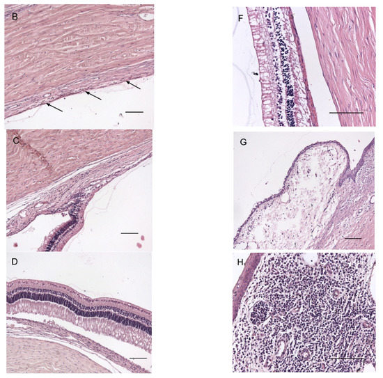 Histological findings: cryo group (A–D) and non-cryo group (E–H). Changes at the cryotherapy site: (A) intact sclera, thinned choroid, and retina partially replaced by choroidal tissue that has penetrated the disrupted pigment epithelium, (B) thin limiting membrane with few cells on the surface (arrows), (C) The transitional zone border between normal retina/choroid and a chorioretinal scar, (D) Intact retina and choroid outside the site of applied cryotherapy, (E,F) intact eyeball layers, and (G,H) edematous and inflammatory changes in the conjunctiva. Bars = 100 µm.