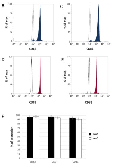 Exosomes were isolated by centrifugation and ultra- centrifugation from conditioned medium of dental pulp mesenchymal stem cells derived from young donors (exoY) and from older donors (exoO). Homogeneity and size of the purified exosomes were characterized by NanoSight using Nanoparticle tracking software (NTA) (Figure 1A, black bars for exoY, white bars for exoO) showed that the average size of the diameters of most EXOs ranged from 80 to 160 nm. NanoSight images and the presence of single peak size distribution profile indicate that the nano-sized vesicles isolated from the conditioned media of both classes of exosomes are highly purified (Figure 1). Cytofluorimeter analyses of specific exosome-related markers (i.e., CD63 and CD 81) revealed no difference between the two exosome types (exoY and O) as reported on Figure 1B–E. Molecular biology results identified exosomes-specific markers CD9, CD63, and CD81 in the analyzed exosomes (Figure 1F black bars for exoY, white bars for exoO). TEM demonstrated that EXOs presented as cup or round-shaped vesicles for exoY (Figure 1C) and for exoO (Figure 1D), respectively.