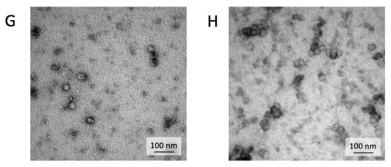 For the visualization of exosomes, it was resorted to electronic microscopy as previously described [29]. Briefly, the exosome fraction, isolated as mentioned in Section 2.2, was fixed in a 2.5% glutaraldehyde/0.1 M sodium cacodylate buffer for 12 h at 4 °C. A solution of 1% OsO4/0.1 M sodium cacodylate buffer was used to maintain pH during fixation. The exosome fraction was then dehydrated by exposure to increasing concentrations of EtOH. Condensation of the sample was achieved with the use of epoxy resin (EPON™, Hexion, Houston, TX, USA). For the preparation of slides, ultrathin sections were prepared by cutting the fixed sample with ultramicrotome (LKB, Stockholm, Sweden), which were then stained with 1% uranyl acetate and 1% citrate solution. TEM microscope (Tecnai G12, FEI Company, Hillsboro, OR, USA) was used for sample visualization with acceleration voltage of 100 kV. Images were acquired by video camera (Tietz, Tietz Video and Image Processing Systems GmbH, Gauting, Germany) mounted on the microscope, and the imaging software TIA (FEI Company, Hillsboro, OR, USA).