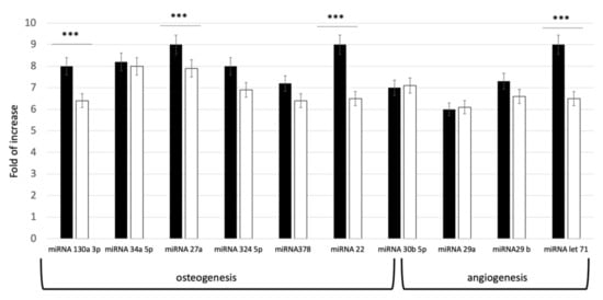 Expression levels of specific miRNA related to Osteogenesis and Angiogenesis pathways in young (black bar) and old (white bar) donors. *** p < 0.001.