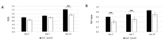 MTT (A) and PDT (B) assay of MSCs after treatment with exoY and exoO at 3, 7 and 10 days. *** p < 0.001.