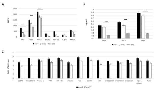 A decline in human DPSC function is observed with aging, and this could be a critical issue if applied to bone regeneration [14]. The aforementioned osteogenesis process is mediated by angiogenesis, in which blood supply induces osteoblast migration and bone mineralization. Therefore, also the angiogenetic commitment of stem cells is fundamental, as angiogenesis is closely associated with osteogenesis during the treatment of traumatic injuries and bone repair [12,32]. Our findings showed that the treatment of MSCs with exosomes derived from younger donor induced a higher production of angiogenic factor such as VEGF and HGF, compared with the exoO group (Figure 4A). In a study by Paino et al., stem cells from human dental pulp showed angiogenic potential as well as the ability to create vascularized woven bone tissue without the use of scaffolds [40]. Likewise, as revealed in Figure 4C, the expression of osteogenesis-related genes, such as ALP and RUNX2, was remarkably improved (FC > 2, p < 0.05) in the treatment group with exoY (Figure 4C).