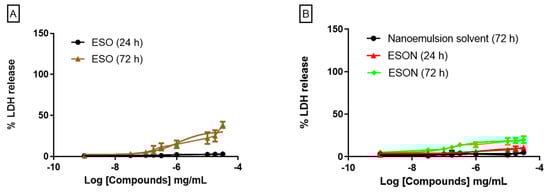 Cytotoxicity effect of ESO and ESON on mammalian cells evaluated by LDH release. (A) LDH release quantification after the stimulus with crescent ESO concentrations for 24 and 72 h; (B) LDH release quantification after the stimulus with crescent ESON concentrations for 24 and 72 h. Profiles are representative of 3–4 independent experiments for LDH release.