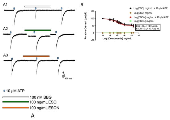 Dose–concentration curves for ESO and ESON inhibition on large-conductance channel activity. (A) Whole-cell macroscopic currents recorded P2X7R activated by 1 mM ATP for 5 min at 30–37 °C on MPM. The reversibility of the inhibitory effect of 1 mM ATP for 5 min followed by perfusion of concentrations of ESO, ESON, or 100 nM BBG. After the washout, another pulse of 1 mM ATP was applied; (B) the plot represents the quantification of the data observed in (A1–A3); % relative current recorded as a function of the ratio between the amplitude of the ionic current and cell capacitance. Values represent mean + SEM. Profiles are representative of 4–5 different experiments.