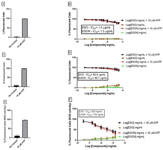 ESO and ESON effect on P2X7R activity. (A) No treated cells and cells treated with ATP analyzed with Sodium Green assay. (B) Dose–response curves of ESO and ESON with or without 10 µM ATP to detect changes in intracellular Na+ concentrations with Sodium Green assay. (C) No treated cells and cells treated with ATP analyzed with Fluo-3 assay. (D) Flow cytometry analyzed the dose–response curves of ESO and ESON with or without 10 µM ATP to detect changes in intracellular Ca2+ with Fluo-3 dye. (E) No treated cells and cells treated with ATP analyzed with DCFH2-DA dye. (F) Dose–response curves of ESO and ESON with or without 10 µM ATP analyzed by fluorescence plate reader to detect changes in intracellular ROS with DCFH2-DA dye; Values represent mean + SEM of total % ATP fluorescence effect. Profiles are representative of 3 separate experiments for Na+ and Ca2+ assay and 7 separate experiments for ROS assay.
