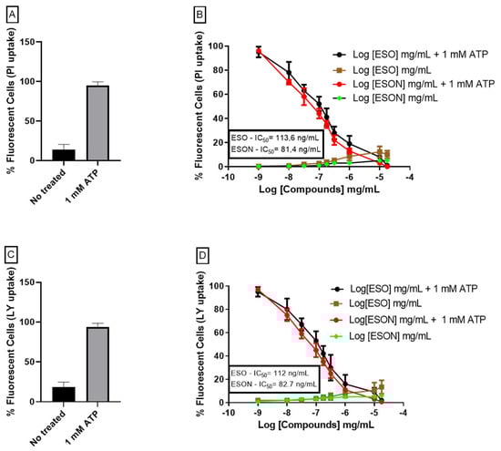 We induced P2X7R pore formation treating MPM with 1 mM ATP for 25 min. ATP- induced PI (cationic) or LY (anionic) dye uptake was similar [18]. However, ESO treatment inhibited ATP-induced PI and LY uptake with an IC50 value of 113. 3 ± 3.7 * ng/mL and 112 ± 2.6 ** ng/mL, respectively (Figure 4A,B). Additionally, the concentrations between 1 and 25 mg/mL spontaneously caused a poor dye uptake (Figure 4A,B). ESON ameliorates the ESO effect, reducing the IC50 values for 81.4 ± 7.2 * ng/mL, (* p < 0.05) and 82.7 ± 5.5 **, (** p < 0.05) ng/mL (Figure 4A,B), respectively. Additionally, ESON did not cause dye uptake when added alone.