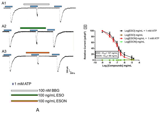 Dose–concentration curves for ESO and ESON inhibition on P2X7R cationic channel activity. (A) Whole-cell recordings of the cationic P2X7R activated by 10 µM ATP for 5 s at 30–37 °C on MPM. The reversibility of the inhibitory effect: a pulse of 10 µM ATP followed by perfusion of concentrations of ESO, ESON, or 100 nM BBG. After the washout, another pulse of 10 µM ATP was applied; (B) the plot represents the quantification of the data observed in (A1–A3); % relative current was recorded as a function of the ratio between the amplitude of the ionic current and cell capacitance. In all assays, we added the antagonists before ATP stimulation (1–10 min). Profiles are representative of 4 experiments for whole-cell recordings. p > 0.05 when compared to positive control.