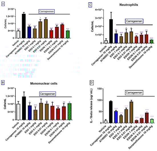Effect of ESO and ESON on ATP-induced pleurisy. Mice orally pretreated (1 h) with ESO and ESON (1, 0.1, and 0,01 mg/kg), dexamethasone and A740003 (10 mg/kg) before carrageenan-challenge. (A) Total cellularity, (B) number of mononuclear cells, (C) number of neutrophils, and (D) level of IL-1β. The results are represented as the means ± SD from 4 assays on different days with five mice for each group. * p < 0.05; ** p < 0.01; *** p < 0.001 in comparison with the carrageenan group.