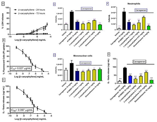 β-caryophyllene is the primary essential oil component (Scheme 1). Thus, we evaluated this molecule as a critical responsibility for inhibiting the P2X7R function. After 24 h of analysis, the dose–response curve promoted moderate toxicity with a CC50 value of 29 ± 2 µg/mL (Figure 7A). In the ATP-induced dye uptake assay, β-caryophyllene potently inhibited the P2X7R function with an IC50 value of 26 ± 0.007 ng/mL (Figure 7B). Additionally, this substance reduced ATP-induced IL-1β with an IC50 value of 97 ± 0.012 ng/mL (Figure 7C). Carrageenan-induced mice peritonitis’ effect was moderately inhibited for 1 µg/kg β-caryophyllene previously treated for 1 h. However, 0.1 and 0.01 µg/kg potently reversed the carrageenan effect comparable to dexamethasone and A740003 treatments (Figure 7D).