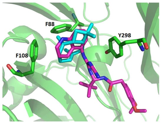 The blind molecular docking of A740003 predicted most of its interaction into the allosteric site. As revealed in the Karasawa e Kawate (2016) work [27], the A740003 quinolone ring established hydrophobic interactions with Phe88 and Tyr298 residues of the dimethoxybenzene ring and established hydrophobic interactions with Tyr299.