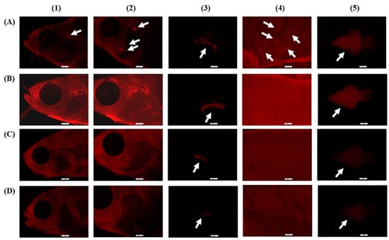 Fluorescence microscopy images of CONR-EtOH (A), CONR-NE (B), CONR-SMEDDS (C), and CONR-SNEDDS (D) accumulated in external and internal organs of transparent zebrafish: head (1), gill (2), gill filament (3), skin (4), and brain (5). These illustrations are demonstrated for qualitative determination.