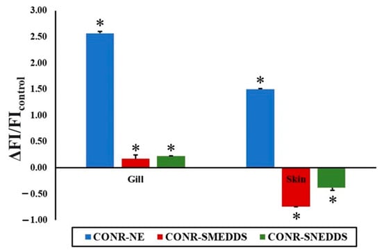 Fluorescence was not observed in fish treated with CO nanoformulations without the Nile Red dye. CO labeled with Nile red dye upon contact with the fish can be clearly detected in red. As shown in Figure 2, the red spots in the fish as pointed by the white arrows indicate the location of CO with Nile Red dye. It was observed that they were located mostly in the gill and the skin of the fish. Among the test formulations, CO-NE showed the highest fluorescence intensity during external screening. To confirm this result, the relative fluorescence intensity in the fish skin and gills after exposure to the nanoformulations compared to CONR-EtOH, as a control, was calculated using Equation (4).
