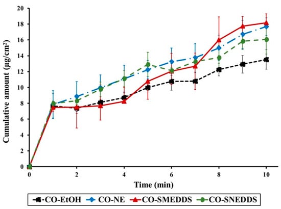 Cumulative permeation of eugenol through zebrafish skin versus time of the different CO formulations. Data are presented as means ± SD (n = 3).