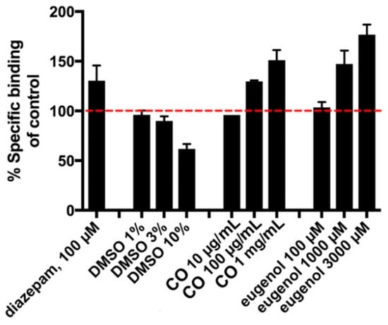Based on a known correlation between sedative effect and positive modulation of GABAA receptors [,,,,], we further tested CO using a [3H]muscimol-binding assay in rat cortical homogenate. The well-known positive allosteric modulator, diazepam, was used as a positive control and was—as expected—found to increase the specific binding to approximately 130%, as shown in Figure 6. To initially test the potential GABAA modulatory effect of CO, the oil was dissolved directly in DMSO to a maximal concentration of 10 mg/mL. Testing of CO-DMSO solution at the CO concentrations of 100 and 1000 µg/mL showed a concentration-dependent increase in the [3H]muscimol-binding level compared to normal level of total [3H]muscimol binding. However, the results indicated that DMSO at concentrations of 3% and above in itself produced significant inhibition of the specific binding. This precluded generation of a full curve for the pure CO and thus an accurate determination of an EC50 value. Eugenol in DMSO solution similarly produced clear modulation of [3H]muscimol binding at concentrations of 1000 and 3000 µM, indicating that the active compound in the sedative effect of CO includes eugenol. The increase in binding levels induced by both CO and eugenol reached similar or higher levels compared to diazepam. From this study, EC50 values of CO and pure eugenol solutions in DMSO were found to be 1 mg/mL and 1250 µM, respectively.