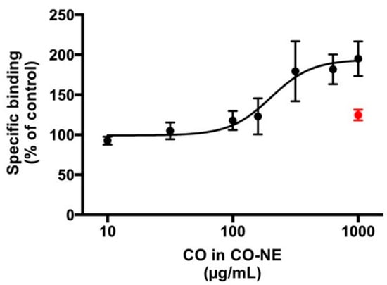Enhancement of [3H]muscimol binding in the presence of CO in CO-NE. The red point denotes the CO-NE vehicle at the highest concentration tested, indicating that this did not per se significantly increase the total binding levels. Data are presented as mean percentage of specific binding ± SD for one representative curve, which was confirmed in three additional, independent experiments. Collected data for four independent repetitions gave an EC50 (pEC50 ± S.E.M.) of 175 µg/mL (3.78 ± 0.09) and an average maximal binding of 189.6 ± 4.5%.