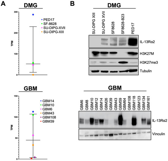 To identify baseline transcript and protein levels of IL-13Rα2 in HGG cells, we performed RNA sequencing and immunoblotting on patient-derived HGG (DMG and adult GBM) cell lines (Figure 1). In accordance with previous investigations [16,52,53], our cohort of sequenced HGG transcriptomes demonstrated highly variable expression of IL-13Rα2 RNA among HGG cell lines (Figure 1A), ranging from low (SU-DIPG XIII-P, GBM39, and GBM108) to intermediate (SU-DIPG XVII, SF8628, GBM43, and GBM6) and high (PED17, GBM10, and GBM14) expression. Next, we evaluated IL-13Rα2 protein levels in available HGG cell lines. IL-13Rα2 protein levels were generally congruent with gene expression in both DMG and adult GBM cell lines (Figure 1B). Several cell models showed high IL-13Rα2 expression, including PED17, GBM10, GBM14, GBM59 and GBM118, while others, such as SU-DIPG XVII, SF8628, SF8628-B23, GBM6, GBM12 and GBM43, showed notably lower (but not absent) IL-13Rα2 levels. IL-13Rα2 expression was not variable between SF8628 and SF8628-B23, indicating expression of this receptor is not impacted by presence of the K27M mutation. A third category of HGG cell lines, including SU-DIPG XIII-P, GBM39, GBM108 and GBM123, demonstrated IL-13Rα2 protein levels that were below the detection threshold of our assay.