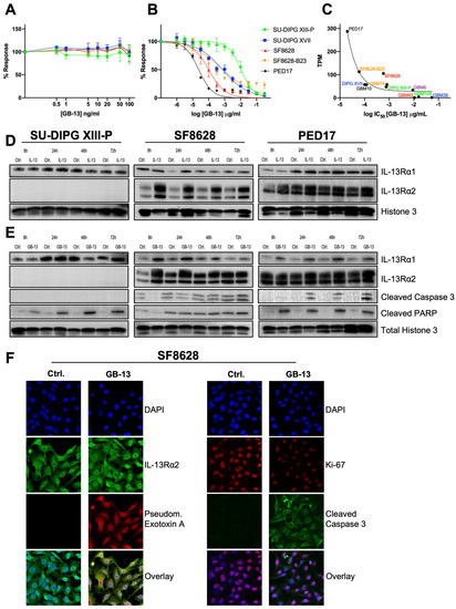 The following supporting information can be downloaded at: https://www.mdpi.com/article/10.3390/pharmaceutics14050922/s1, Figure S1: Cell viability and dose–response curve of adult GBM cell models; Figure S2: DMG and adult GBM cell lines demonstrate similar sensitivity towards GB-13 dependent on IL-13Rα2 status; Figure S3: Immunofluorescence of SF8628 cells, a DMG cell line, after 8, 24, 48, and 72 h of GB-13 exposure at IC50; Figure S4: Immunohistochemistry of PED17-bearing mouse brains harvested at endpoint; Figure S5: Immunohistochemistry of SU-DIPG XIII-P-bearing mouse brains harvested at endpoint; Figure S6: Negative staining controls for immunofluorescence and immunohistochemistry experiments; Table S1: Details regarding the cell lines used in this study; Table S2: Media composition for culture of patient-derived cell lines; Table S3: Antibodies used for immunoblotting, immunofluorescence and immunohistochemistry.