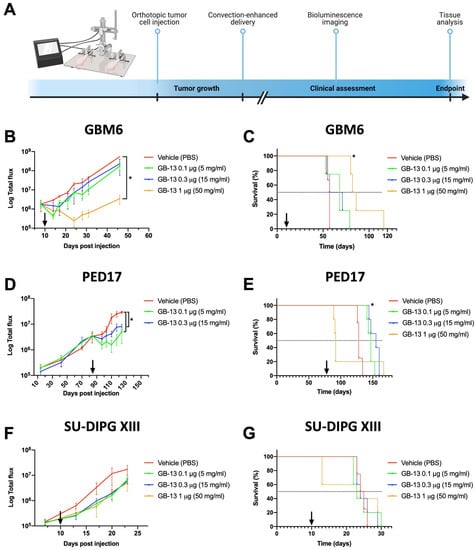 CED infusion of GB-13 results in reduced BLI signals and prolonged survival of IL-13Rα2-upregulated DMG and adult GBM patient-derived xenografts grown as orthotopic tumors. (A) Schematic representation of tumor cell injection and CED workflow (created with BioRender.com, accessed on 7 November 2021). Four to five mice were used per treatment group in each cell model (GBM6 is adult GBM with medium IL-13Rα2 levels; PED17 and SU-DIPG XIII-P are DMG with IL-13Rα2-high and IL-13Rα2-low levels, respectively). A single 1 μg dose of GB-13 by CED (arrow) results in decreased (B) BLI signals (p = 0.01) and (C) prolonged survival of GBM6-bearing animals (p = 0.01). (D) BLI signals in PED17 xenografts are reduced following 0.1 μg (p = 0.0001) or 0.3 μg (p = 0.0004) of GB-13. (E) 0.1 μg (p = 0.003) and 0.3 μg (p = 0.003) dose levels extend survival without a notable dose–response, but a 1 μg dose of GB-13 is associated with lethal toxicity in 4 out of 5 animals approximately 72 h after the infusion. In SU-DIPG XIII-P animals, CED of GB-13 is not associated with (F) reduced BLI signals or (G) survival benefit. BLI data are presented as the mean ± standard deviation, and significance between groups was calculated using two-tailed Student’s t-tests. Significance of endpoint comparison between treatment groups were calculated using the Log-Rank test.